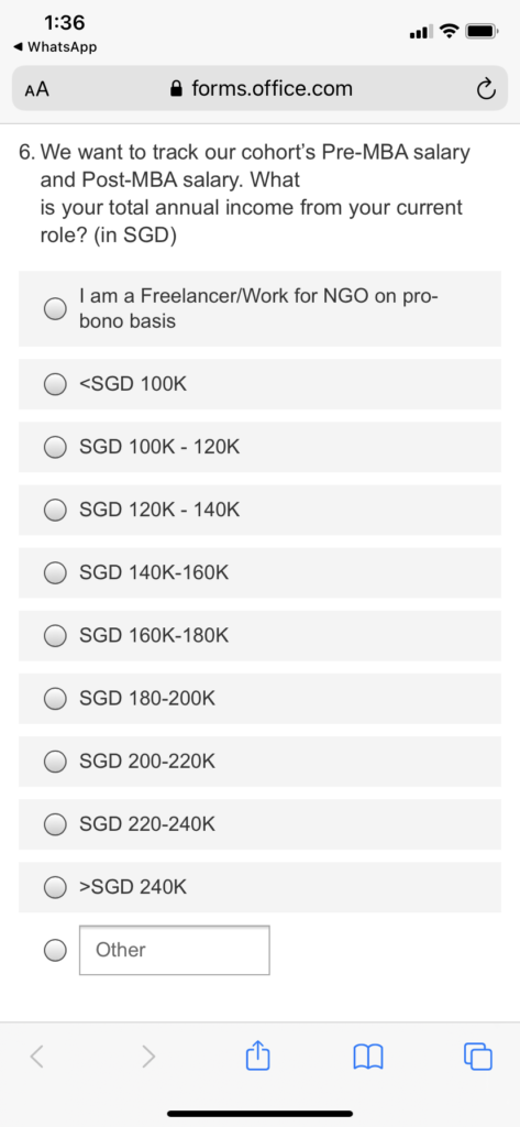 まず、入学前の段階で大きな衝撃を受けた出来事があります。シンガポール国立大学(NUS)に合格し入学手続きを進めていく中で、現在の年収を入力する項目がありました。その内容自体は珍しくありませんが、問題は提示されている年収レンジでした。最低ラインがSGD100K (NGOなどを除く)、つまり現在のレートで約1,240万円からスタートしていたのです。日本では年収1,000万円を超える会社員は一部に限られる中で、この水準が前提となっていることに正直驚きました。どれほど高いレベルの人材が集まる環境なのか、この時点で実感させられました。